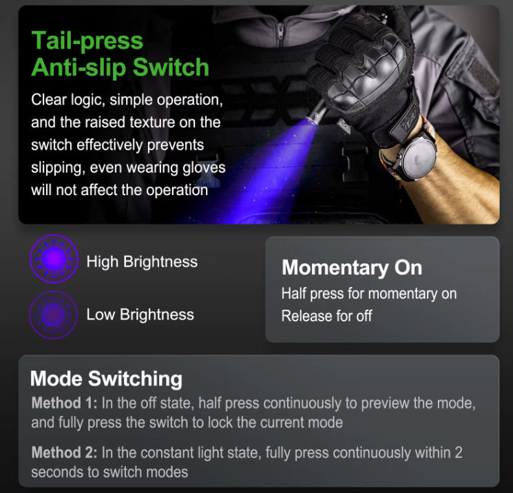 Les opérations sur le terrain exigent de la flexibilité, et la Nextorch K33 est à la hauteur grâce à son système à double alimentation. La batterie Li-ion principale offre plus de 8 heures d'autonomie à faible consommation, parfaite pour le traitement méthodique des scènes. La possibilité de passer à des piles AAA standard garantit que vous pouvez maintenir votre capacité opérationnelle pendant des périodes de travail prolongées. L'interrupteur arrière tactique, optimisé pour une utilisation avec des gants, fournit une activation momentanée et constante pour correspondre à votre style de travail.