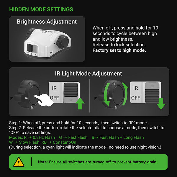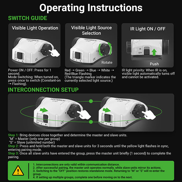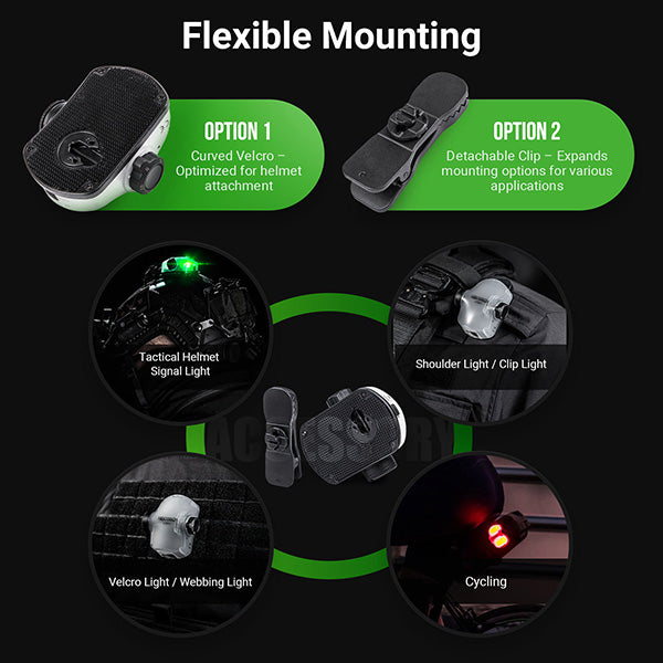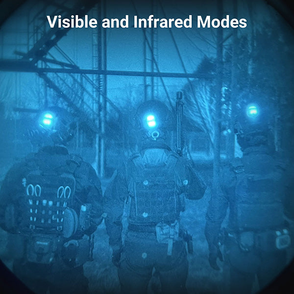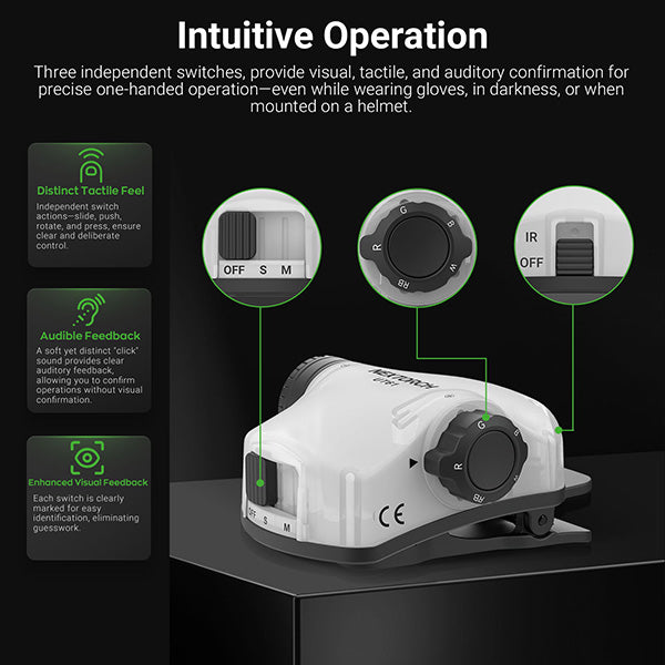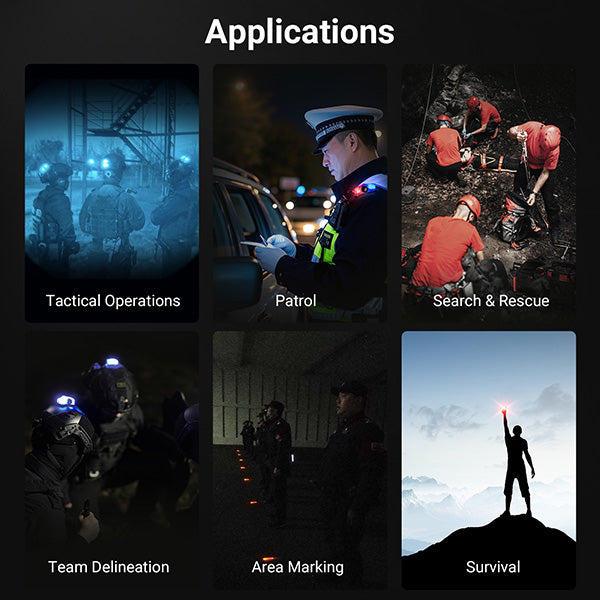 La lampe propose 5 sources lumineuses indépendantes adaptées à toutes les situations : lumière blanche pour l'éclairage général, lumière rouge pour préserver la vision nocturne, lumière verte pour la lecture de cartes, lumière bleue pour le suivi de traces, et lumière infrarouge pour les opérations avec intensificateurs de lumière. Sa tête orientable à 120° optimise la directionnalité du faisceau, tandis que son interrupteur arrière permet une manipulation intuitive sous pression.