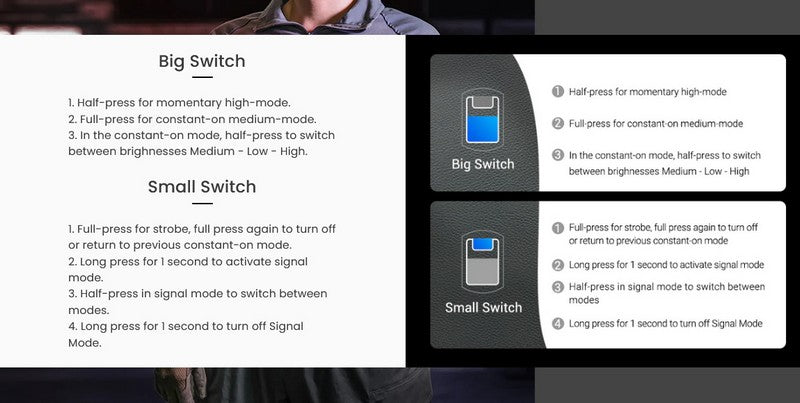 La lampe dispose de 3 modes plus le mode STROBE, ainsi son pilotage est épuré et le plus simple possible.