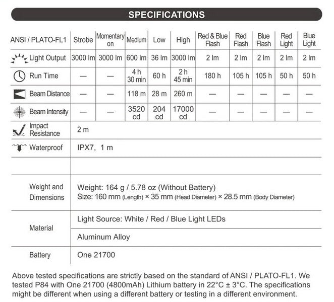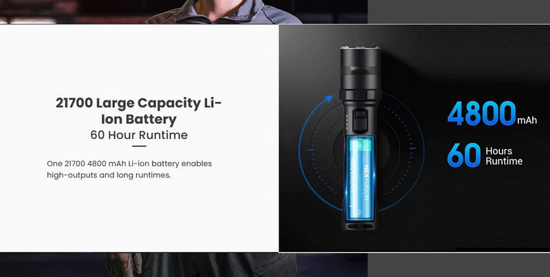 Cette lampe Nextorch P84 est alimentée par une batterie 21700 4800 mAh pour une autonomie de 60 heures max dans le mode à 36 Lumens.