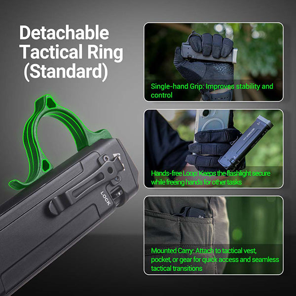 La lampe tactique propose 3 modes de fonctionnement adaptés à toutes les situations : mode Tactique pour les interventions et la suppression, mode Duty pour l'usage quotidien et les patrouilles, et mode Lock pour éviter les activations accidentelles. Sa bague rotative de sélection de mode optimise les opérations à l'aveugle, tandis que son double interrupteur (queue tactique + port USB-C) permet un contrôle précis sous stress.
