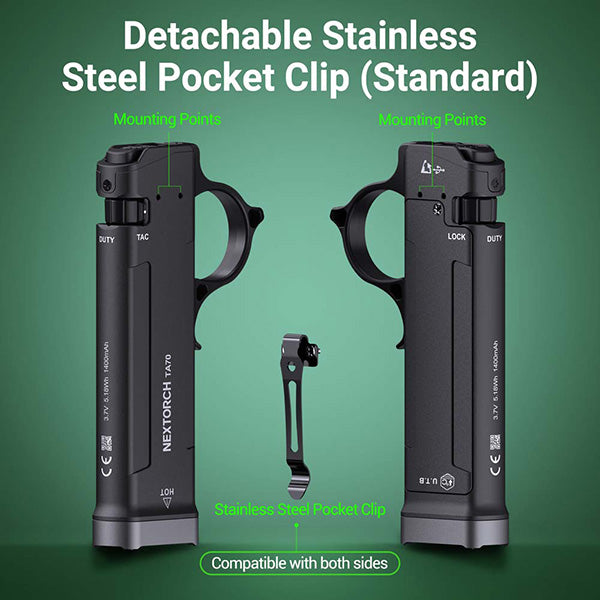 La lampe tactique Nextorch TA70 est une lampe EDC ultra-compacte offrant 3500 lumens et une portée de 220 mètres. Équipée de la technologie exclusive U.T.B Ultra Thermal Buffer de Nextorch, elle maintient une luminosité maximale tout en conservant une température de prise en main confortable lors d'une utilisation prolongée à forte intensité, ce qui la rend idéale pour les opérations tactiques et l'intervention d'urgence.