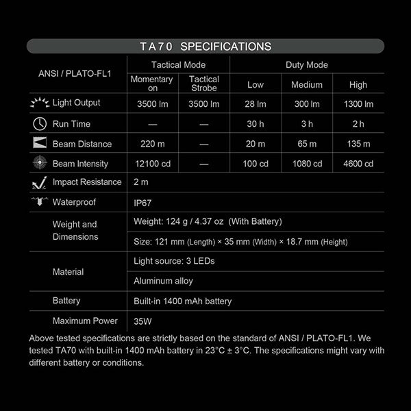 Conçue pour les opérateurs tactiques, les patrouilles, les professionnels de l'outdoor et les services d'urgence, la TA70 est fabriquée en aluminium aéronautique de qualité militaire et bénéficie d'une protection IP67 contre l'eau et la poussière ainsi qu'une résistance aux chocs de 2 mètres. Son corps monobloc ultra-compact assure une prise en main naturelle et un transport discret en poche ou sur équipement MOLLE.