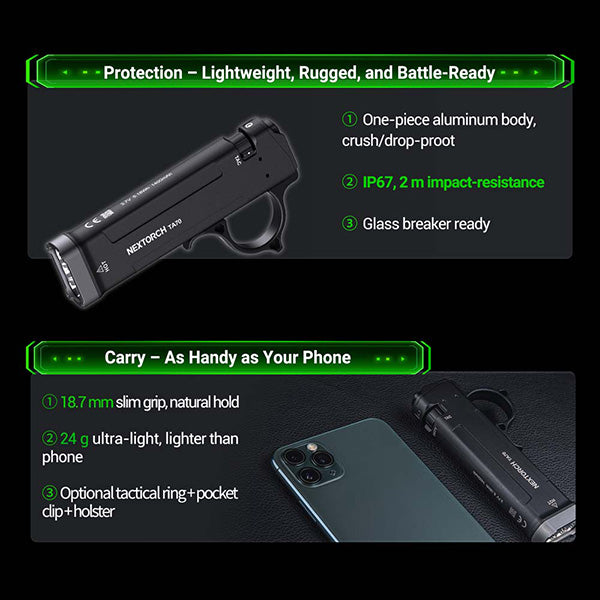 Rechargeable via port USB-C caché, la Nextorch TA70 est l’outil d’éclairage idéal pour les forces de l’ordre, militaires, agents de sécurité, pompiers et les passionnés d’outdoor exigeant un équipement tactique, fiable et performant.